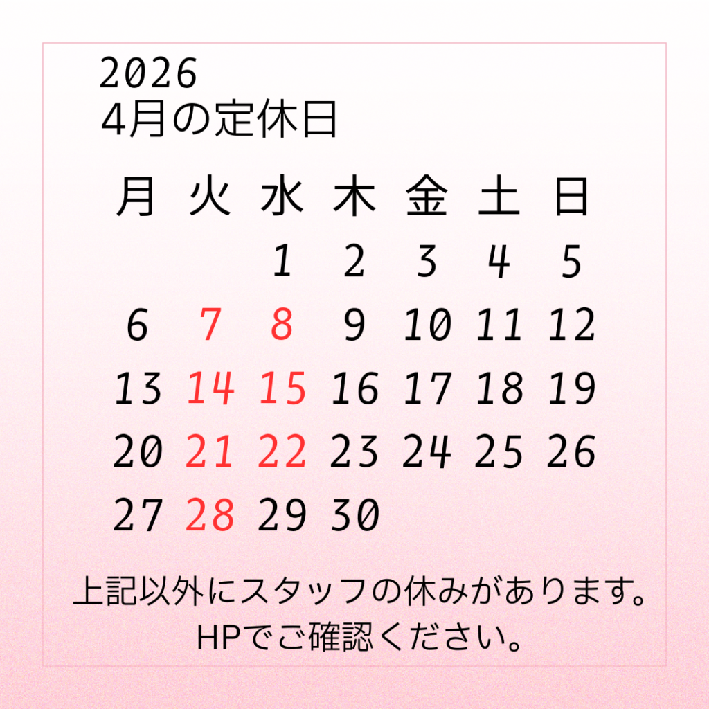 上記以外に、1日(水)石井・6日(月)鈴木が休みです。